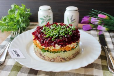Готовим сытный, яркий и красивый слоёный салат шуба с сардиной по мотивам популярного праздничного салата “Сельдь под шубой”.