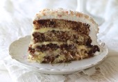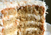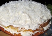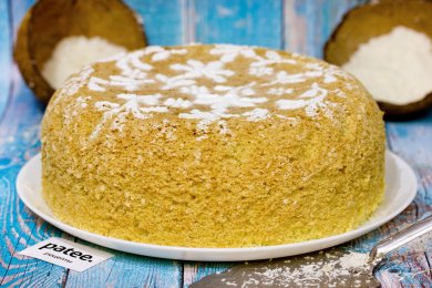 Торт из трех коржей с кокосовым молоком и кокосовой стружкой, промазанный сливочным кремом с кокосовым молоком и обсыпанный кокосовой стружкой.