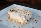 Сладкий пирог со сливочно-кокосовой начинкой, покрытый взбитыми сливками и посыпанный кокосовой стружкой.