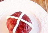 Красные булочки из дрожжевого теста, украшенные крестом из сливочной глазури.