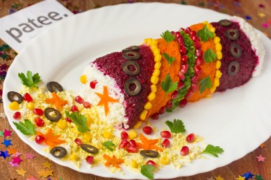 Закуску из солёной сельди с вареной свёклой и консервированным горошком обычно принято подавать ко всевозможным блюдам из картофеля.