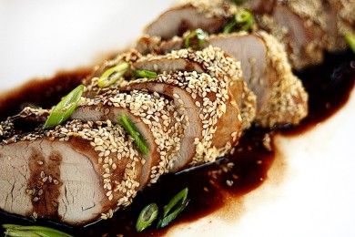 Свиная вырезка, маринованная в соевом соусе с уксусом и слециями, покрытая медовой глазурью с соусом хойсин и кунжутом и запеченная в духовке.