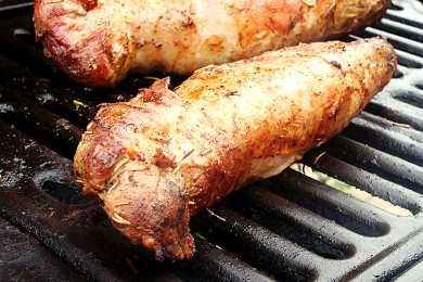 Свиная вырезка на гриле, маринованная в соусе из оливкового масла, уксуса, розмарина и чеснока.