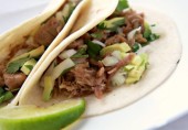 Тако со свининой, тушенной в медленноварке с лаймовым и апельсиновым соком, чесноком и специями и поджаренной на оливковом масле.