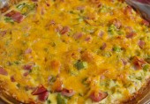 Готовим французский слоеный пирог “Киш” с мелко нарезанным подрумяненным картофелем, варёным окороком, овощами и сыром Чеддер.