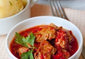 Готовим гуляш из свинины с копчеными колбасками. Нежные кусочки мяса в замечательном соусе. Блюдо необычайно ароматное, насыщенное, в меру острое и вкусное.