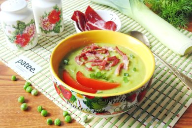 Этот суп для любителей супов-пюре или кремовых супов. Нежный, воздушный, ароматный и вкусный. Готовится на мясном бульоне из мороженого зеленого горошка с картофелем и луком- пореем.