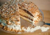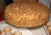 Медовый торт из песочного теста, состоящий из 8-10 коржей, промазанный кремом со сгущенкой и посыпанный песочно-ореховой крошкой.