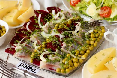 Закуску из солёной сельди с вареной свёклой и консервированным горошком обычно принято подавать ко всевозможным блюдам из картофеля.
