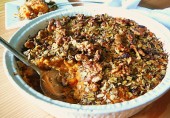 Отличный завртак - запеканка из отварного сладкого картофеля с овсяными хлопьями, сладким сиропом, льняной мукой и специями, посыпанная смесью из рубленых грецких орехов с овсяными хлопьями и семенами чиа.