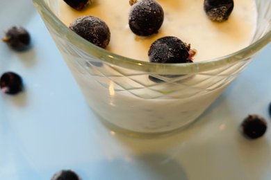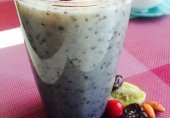 Освежающий напиток из овсяных хлопьев с клубникой, черникой, йогуртом, молоком и семенами чиа.