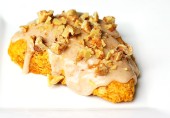 Булочки с тыквенным пюре, корицей, имбирем, мускатным орехом и цедрой апельсина, покрытые глазурью и поджаренными грецкими орехами.