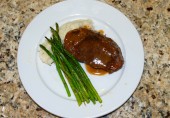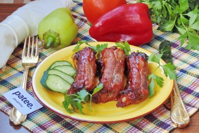 Свиные ребрышки, тушеные в медовом соусе барбекю с добавлением красного вина и лука. Мясо получается очень нежным и вкусным.