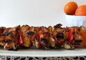 Шашлык из куриного филе с перцем, луком и мандаринами, смазанный соусом для барбекю с мандариновым соком.