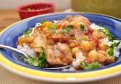 Тажин, приготовленный из куриных бедер, гарам масала, помидоров, нута и кураги.
