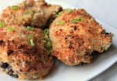 Окорочка, покрытые йогуртом со специями гарам масала, чесноком и зеленым луком, обваленные в сухарях и запеченные в духовке.