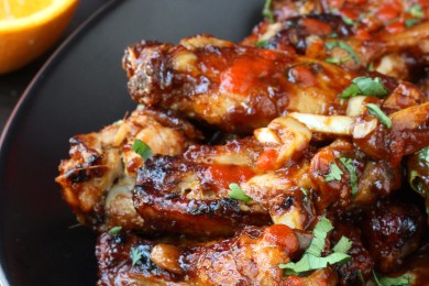 Куриные крылья, маринованные в соевом соусе с имбирно-чесночной пастой и запеченные в духовке, в чесночном соусе с перцем чили, специями гарам масала и ананасовым соком.