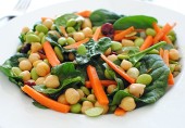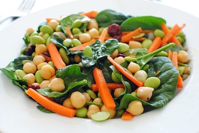 Попробуйте вкусный и полезный салат с эдамаме, нутом, морковью и шпинатом.
