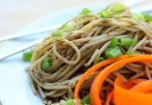 Спагетти в соусе из чеснока с луком, арахисовым маслом, соевым соусом, рисовым уксусом и вином. Подавайте пасту с тертой морковью, арахисом и зеленым луком.