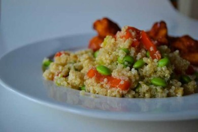 Салат из киноа, соевых бобов эдамаме и обжаренного перца с зеленым луком и чесноком, заправленный оливковым маслом с уксусом и зеленью.