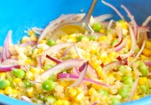 Салат из киноа с кукурузой, соевыми бобами эдамаме и луком, заправленный оливковым маслом с винным уксусом, лимонным соком и базиликом.