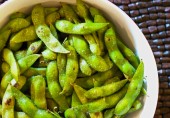 Соевые бобы эдамаме, отваренные и обжаренные в масле с чесноком. Подавайте с соевым соусом и васаби.