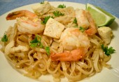 Традиционное блюдо тайской кухни - рисовая лапша с креветками, соевым творогом тофу, пророщенными бобами, чесноком, тамариндом и специями, удивительное сочетание сладкого с острым, пряным и соленым.