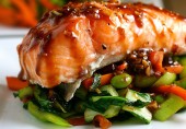 Филе лосося, политое кунжутным маслом и запеченное в духовке, и морковь с китайской капустой и соевыми бобами эдамаме, приготовленные на кунжутном масле.