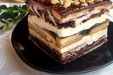 Ніжні бісквітні коржі перемащені заварним кремом з прослойом желе .