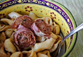 Итальянский суп на основе куриного бульона и колбасок с добавлением ньокки - итальянских клецек.