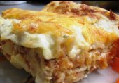 Слоеная запеканка из лазаньи с соусом из говяжьего фарша со специями и соусом бешамель, посыпанная тертым сыром.