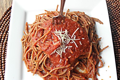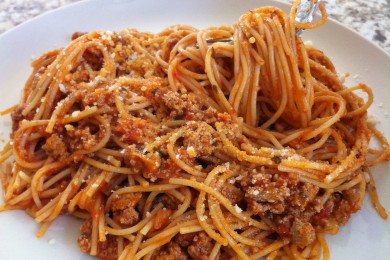 Паста Волосы ангела (тонкие спагетти) с томатным соусом с чесноком, сушеной зеленью и тертым пармезаном.
