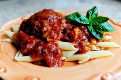 Окорочка, обжаренные в оливковом масле и запеченные в соусе маринара с луком и чесноком. Подавайте окорочка с соусом и пастой.