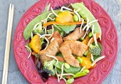 Салат со свининой, апельсиновым соком, кунжутным маслом, мандаринами, китайской лапшой и зеленой фасолью.