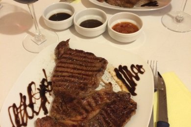 Рибай, соль, перец . Соусы: вучестерский, стей-табаско, апельсиновый с халапенью. Сухое красное:)