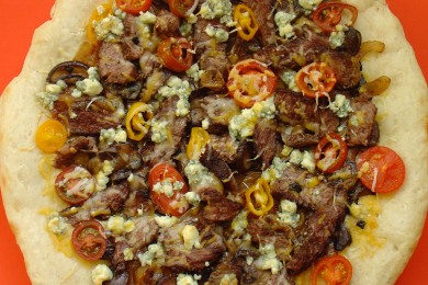 Совместите сразу два любимых блюда: сочный ароматный стейк и изысканную пиццу с грибами, помидорами черри и двумя видами сыра - нежным мягким и пикантным сыром с плесенью.