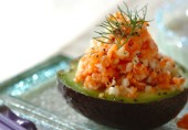 Необыкновенно красивый салат для праздничного стола. Подается на половинке авокадо.