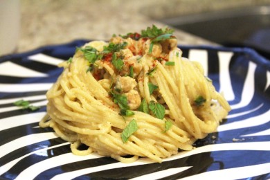 Вегетарианское блюдо - спагетти с нутом и зеленью в соусе из кунжутной пасты тахини с измельченным нутом, копченой паприкой, чесноком и зеленью.
