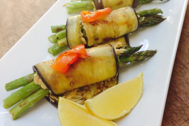 Рулетики из баклажан с соусом из тахини и спаржей.