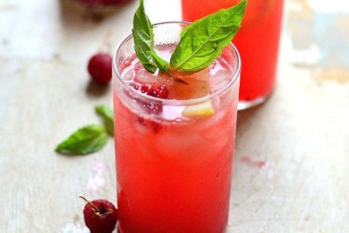 Освежающий коктейль из свежей малины с базиликом, сиропом, джином, биттером, лимонным соком и тоником.