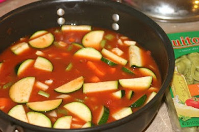 Сытный томатный суп с цуккини и сельдереем с добавлением тортеллини. По желанию можно использовать равиолли.