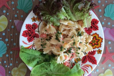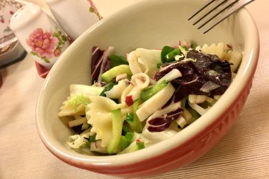 Салат с фарфалле, кальмарами и овощами.