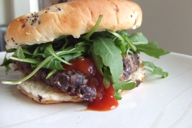 Бургер с черной фасолью, овсяными хлопьями и беконом, приправленный вустерским соусом. Подавать в булочке для бургеров с кетчупом, майонезом и рукколой.