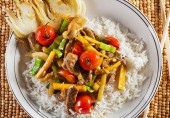 Блюдо японской кухни с насыщенным кисло-сладким вкусом. Немаловажную роль здесь играет соус терияки. Это традиционный японский соевый соус с добавлением сакэ или мирина, сахара или мёда и специй.