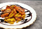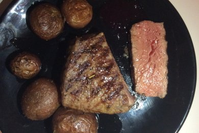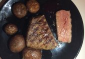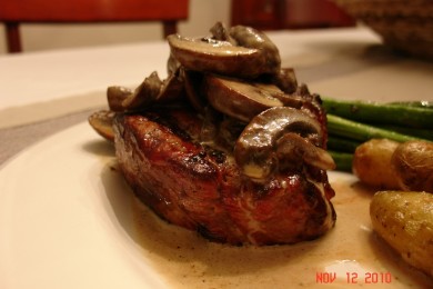 Филе миньон, маринованное в красном вине с чесноком и специями и пожаренное на гриле, со сливочно-грибным соусом.