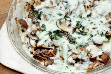 Запеканка из пасты с жареными грибами, беконом и шпинатом в сырном соусе.
