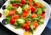 Состав: форель слабосоленая, салат, цветная капуста, желтый перец, оливковое масло