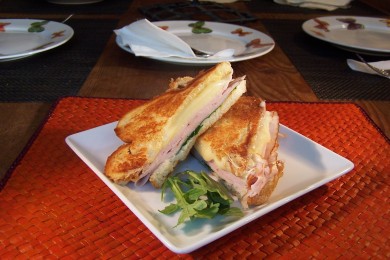 Бутерброд панини с сыром хаварти, ветчиной и перцем халапеньо, смешанным с маслом. Вкусно и аппетитно!