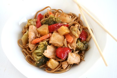 Куриные грудки, паста, китайский соус с овощами и специями и ломтики ананасов.