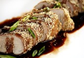 Свиная вырезка, маринованная в соевом соусе с уксусом и слециями, покрытая медовой глазурью с соусом хойсин и кунжутом и запеченная в духовке.